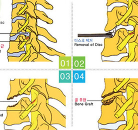 <수술치료 : 미세현미경 디스크 수술 경추> 전신마취 상태에서 수술을 진행하며 목 앞 주름을 따라 약 3~4cm 정도의 피부절개로 현미경을 이용하여 확대하고 병소를 보면서 신경을 다치지 않도록 미세기구를 이용하여 신경을 누르는 디스크와 돌출된 뼈를 제거해 줍니다.